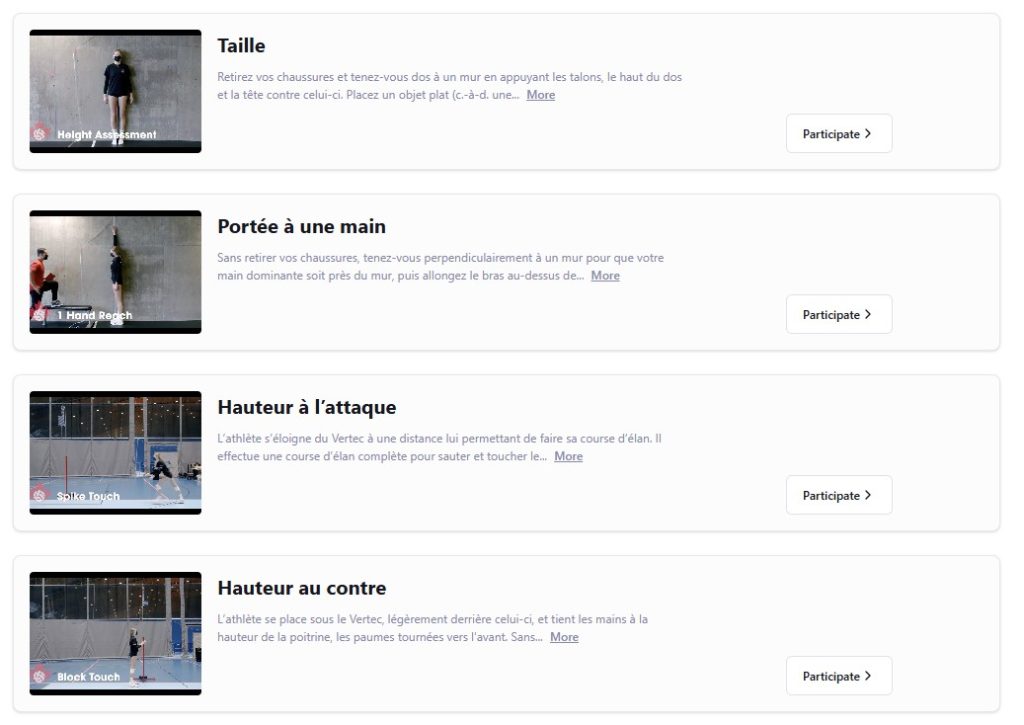 • Tests physiques : visent à mesurer la taille, la portée, le saut d’attaque, le saut de contre et la vitesse, afin d’évaluer le potentiel physique et le développement à long terme des athlètes.